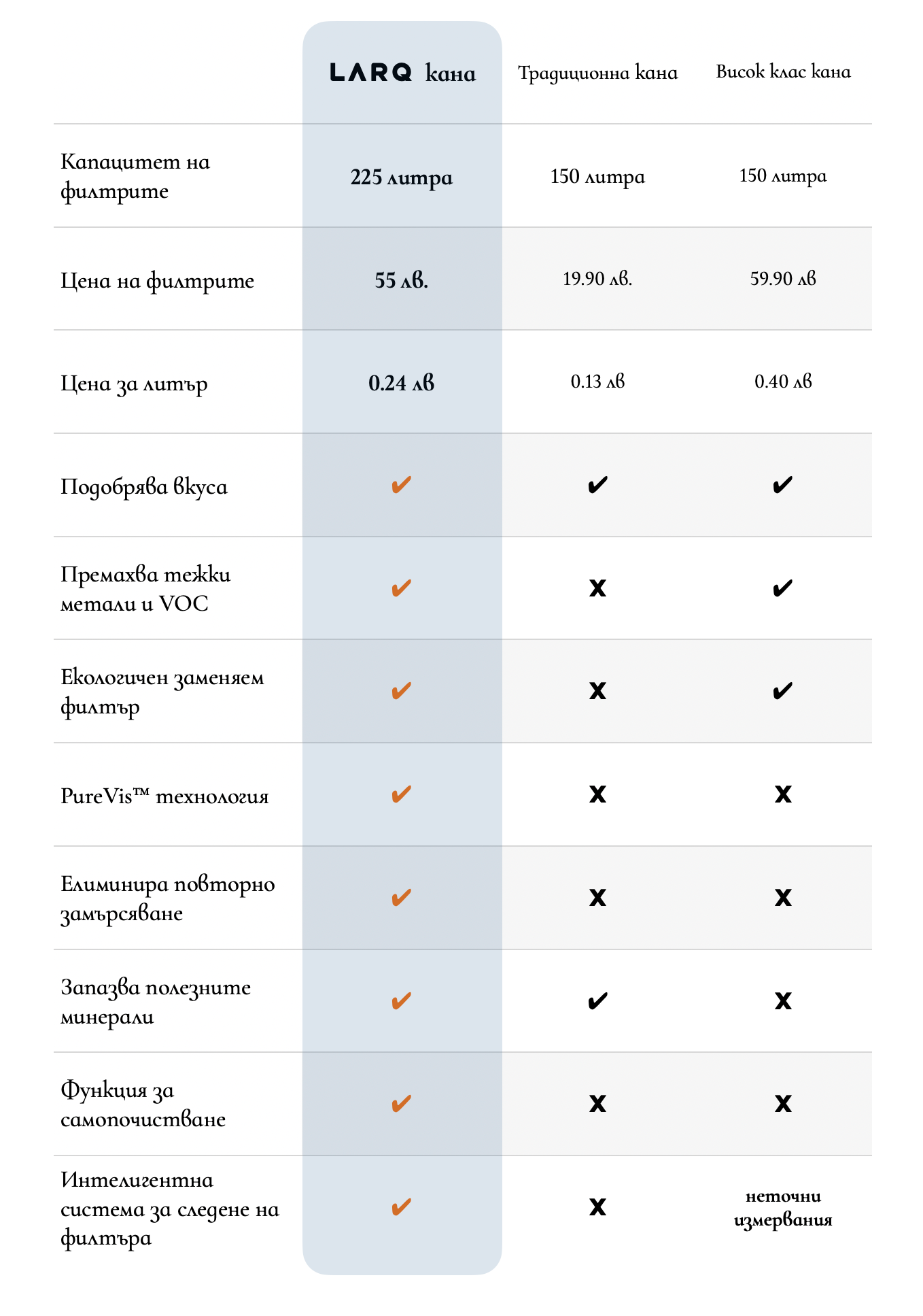 Каната LARQ използва двустъпков процес за подобряване на качеството на водата, който включва PureVis™ технология и Nano Zero филтър, които заедно гарантират най-доброто качество на питайна вода, което може да постигнете.